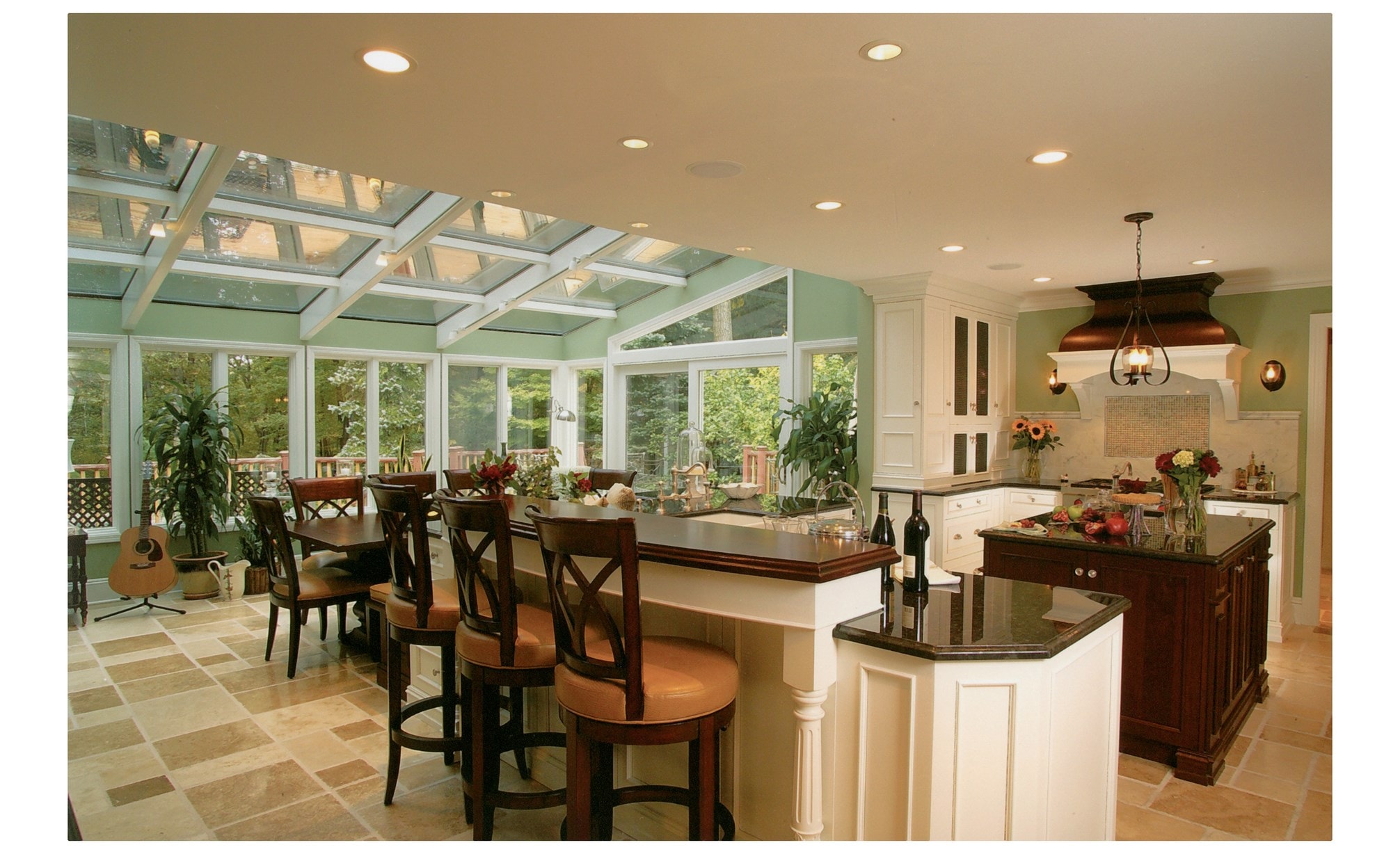 Ian Cairl of Platinum Designs took one look at the adjacent, underutilized sun room all alone in the corner and knew exactly what to do: remove the wall between the rooms to merge them and then marry them visually. Two generous islands now provide great workspace, and guests have multiple places to hang out while keeping the cook company. A custom bench and table overlooking the garden seats up to 10 when the leaves are in place: the perfect spot for homework, crafts, play dates, office work, games and puzzles. A Sub-Zero undercounter fridge near the table, hidden by matching cabinetry, keeps snacks and mealtime essentials nearby. To maintain the feeling of extensive space, walls on either side of the range hood were kept open. This highlights the Wolf 36-inch gas rangetop with sconce lighting and marble backsplash. Even the Wolf oven controls that slip away for a clean look add to the kitchen's new identity as a space for living. "They were putting value on time together and getting the most from their home," says Cairl. "It's not about budget or even about the footprint— it's about being creative in using that footprint. Don't think of spaces as separate. You can merge functions like play dates and entertaining for small and large parties. A place you feel happy and comfortable is really, really important. Regret is really expensive!